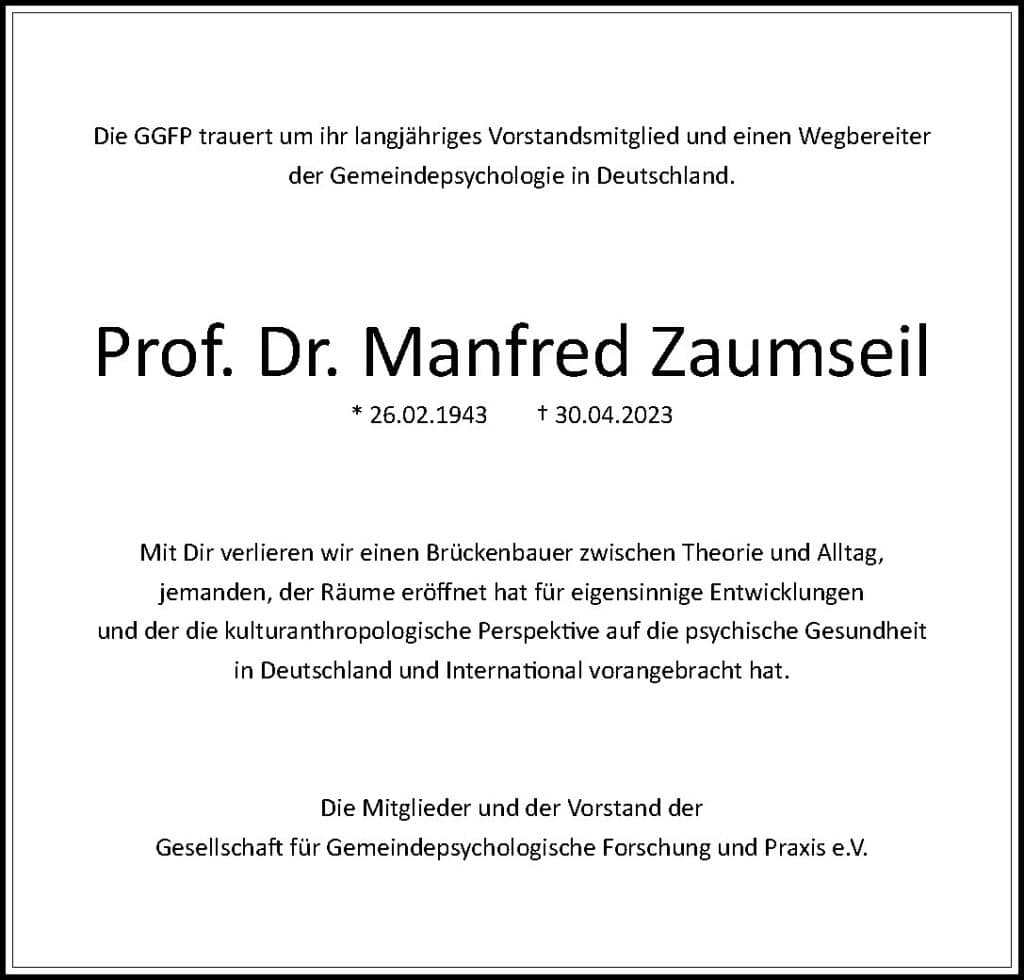 Prof. Dr. Manfred Zaumseil verstarb am 30.04.2023 nach schwerer Krankheit im Kreise seiner Familie. Er wurde am 26.2.1943 geboren und sein Tod kam für viele Gemeindepsycholog*innen und Menschen, die ihm verbunden waren, trotz des Wissens um sein baldiges Ende, doch unvermittelt. Eine Gemeindepsychologie ohne Manfred Zaumseil ist für uns alle nur schwer denkbar.